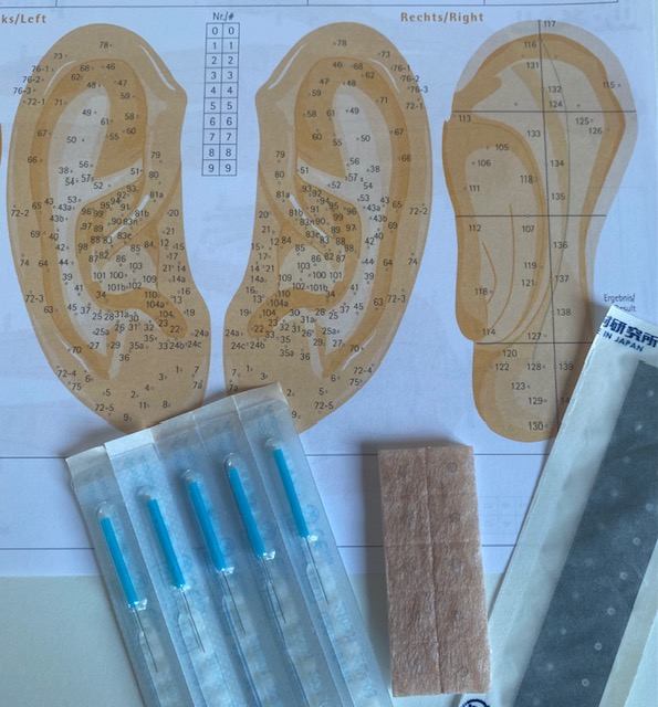 Feinste Akupunkturnadeln werden an den indizierten Stellen in die Haut des Ohres gesetzt. Die Nadeln verbleiben ca. eine 1/2 Std. in der Haut, bis sie sich leicht lösen.